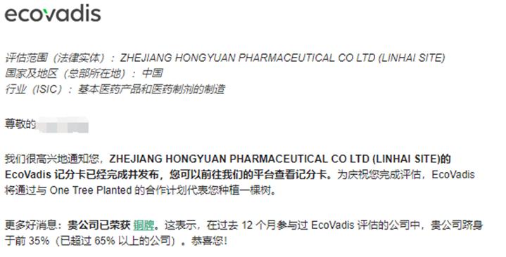 宏元药业自成立以来,就坚持以可持续发展为目标,根据相关监管机构要求依法取得环境影响报告、安全评价报告等资质,并在公司内部建立了劳工安全与健康、环保管理体系,通过了ISO14001、ISO45001等管理体系和TFS社会责任认证。宏元药业于去年安排部署EcoVadis企业社会责任评估相关工作,经过在线问卷、文本分析、分析检查、360°观察等环节,最后完成问卷提交,并于2024年5月17日获得铜牌。这意味着宏元药业在全球范围获得“企业社会责任” 重要加分项,为宏元药业进一步提升自身竞争力,拓展国际市场奠定了坚实基础。今后,宏元药业将进一步强化企业社会责任管理,履行企业社会责任义务,继续做好行业可持续发展的引领者,努力践行可持续化发展与承担社会责任的承诺,与行业上下游通力协作、积极探索,不断提高公司的可持续发展能力,为实现高质量发展目标而不懈努力。